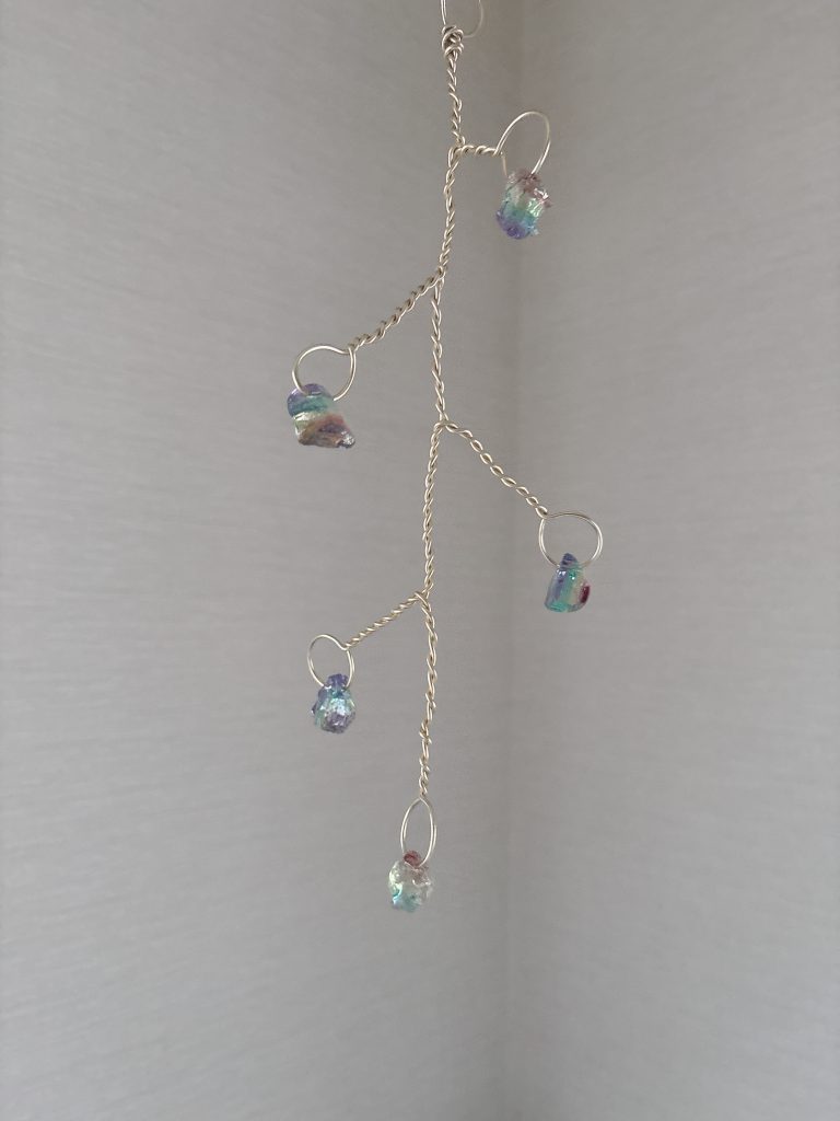 繊細なワイヤーに揺れる虹色のガラスが、まるで光のしずくのように輝くモビール。風に揺れるたびにきらめきを変え、癒しの空間を演出します。インテリアにそっと彩りを添える特別な一品です。